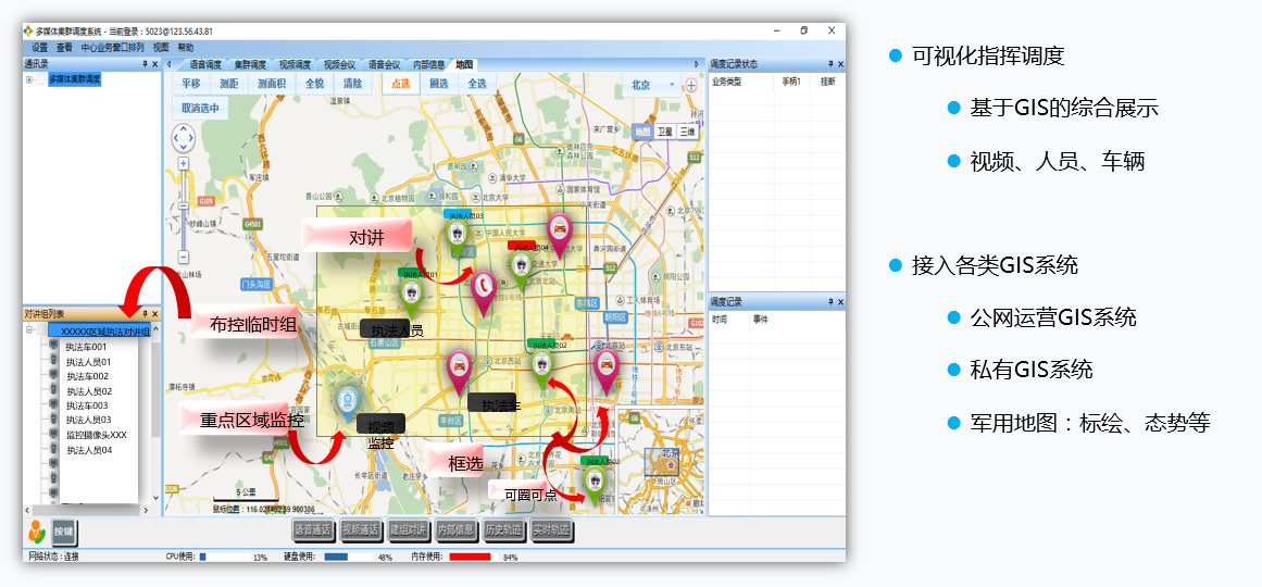 公安局遠程視頻指揮調(diào)度系統(tǒng),實現(xiàn)指揮中心同時對十幾個分隊同時抓捕行動手段支撐,實現(xiàn)抓捕指令統(tǒng)一下達,統(tǒng)一視頻指揮調(diào)度。