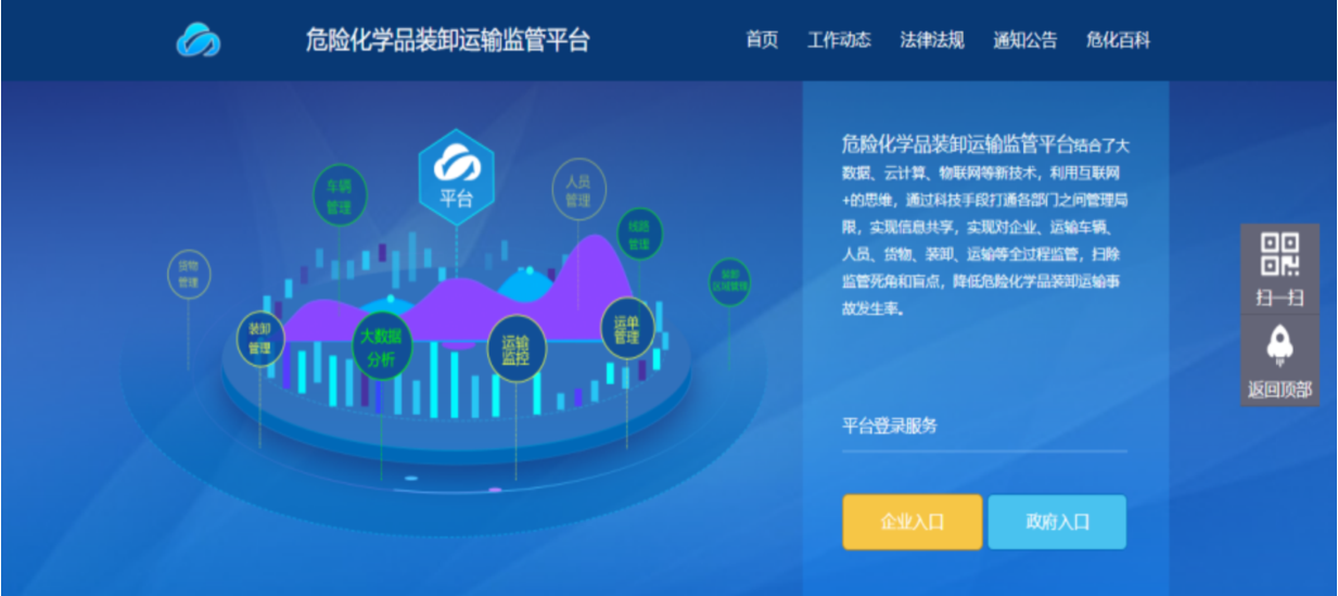 危險(xiǎn)化學(xué)品裝卸運(yùn)輸監(jiān)管平臺(tái),實(shí)現(xiàn)對(duì)危險(xiǎn)貨物運(yùn)輸全過程、全天候的信息采集和動(dòng)態(tài)監(jiān)管,危險(xiǎn)貨物道路運(yùn)輸企業(yè)規(guī)范化、專業(yè)化管理,提升對(duì)危險(xiǎn)貨物運(yùn)輸?shù)木?xì)化、信息化管理水平,實(shí)現(xiàn)對(duì)危險(xiǎn)化學(xué)品生產(chǎn)、銷售、儲(chǔ)存、運(yùn)輸、使用、回收的全過程閉環(huán)管理的重要支撐。